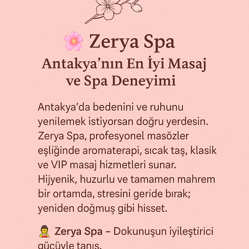 🌸 Zerya Spa – Antakya’nın En İyi Masaj ve Spa Deneyimi Antakya’da bedenini ve ruhunu yenilemek istiyorsan doğru yerdesin. Zerya Spa, profesyonel masözler eşliğinde aromaterapi, sıcak taş, klasik ve VIP masaj hizmetleri sunar. Hijyenik, huzurlu ve tamamen mahrem bir ortamda, stresini geride bırak; yeniden doğmuş gibi hisset. 💆‍♀️ Zerya Spa – Dokunuşun iyileştirici gücüyle tanış.