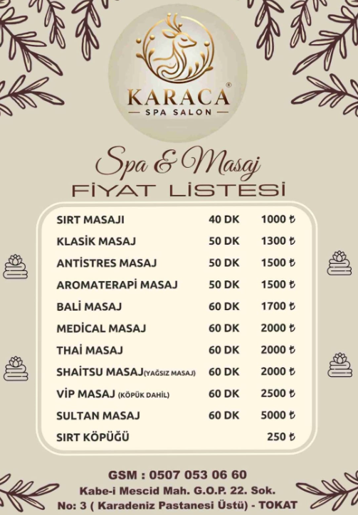 Tokat'ta huzur arayanlar için özel bir köşe! 💆♀️ Günün yorgunluğunu üzerinizden atıp kendinizi şımartmaya ne dersiniz? Profesyonel masaj teknikleriyle rahatlayacak, yenilenmiş hissedeceksiniz. Temiz ve sakin ortamımızda bedeninizi ve ruhunuzu dinlendirin. Hemen arayın, randevunuzu ayarlayın! ✨